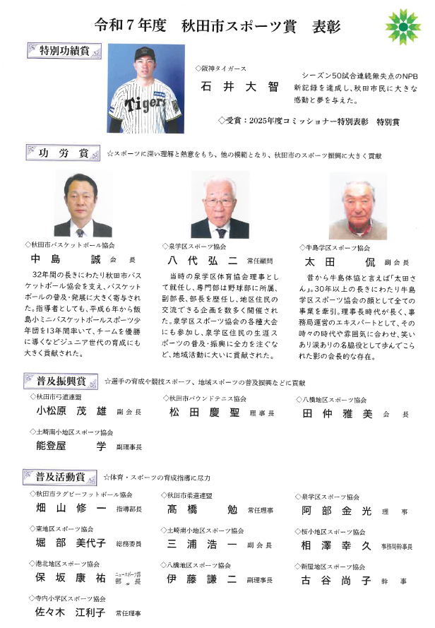 ○秋田市のスポーツの健全な発展に寄与した人物(功労賞・普及振興賞・普及活動賞)や各種競技で秀でた成績を収めた選手(栄光賞・優秀賞・奨励賞)の功績に対し、秋田市のスポーツ振興への貢献を称える賞