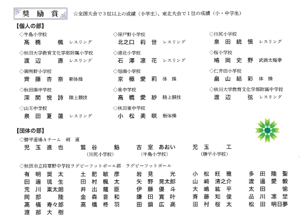 ☆奨 励 賞:小学生が全国大会で3位以上、小・中学生が東北大会で1位の成績
