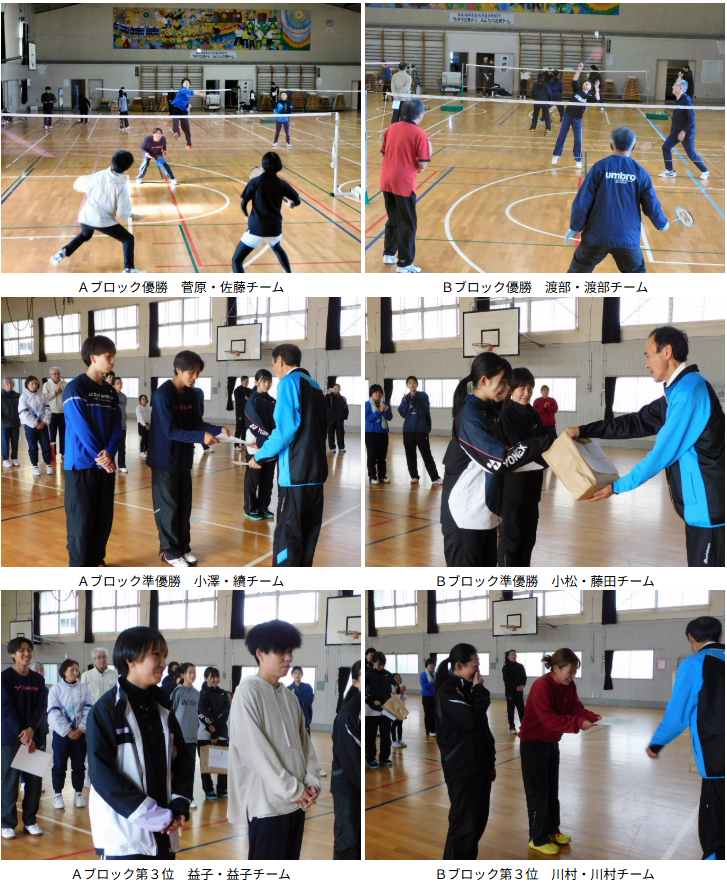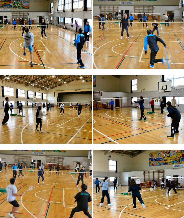 1月14日(水) 東地区スポーツ協会 2026.01.14 11月23日、東地区スポーツ協会主催「バドミントン大会」を開催しました。若者から70代まで参加され、珍プレー好プレーありと、楽しく白熱した試合が展開され、世代間交流の試合となりました。A組・B組による総当たりで試合を実施。4コート使用、全28試合を開催、選手以外の役員、理事さんのご協力によりお昼までに終了しました。