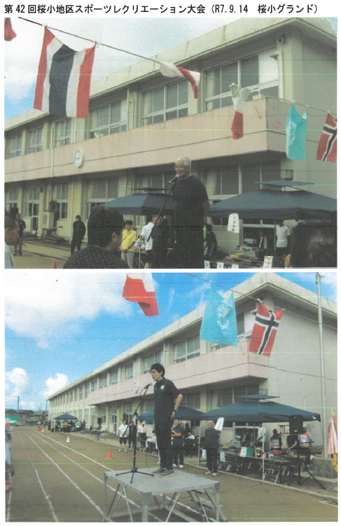 10月1日(水) 2025.10.01 9月14日、桜小地区スポーツ協会主催「第42回桜小地区スポーツレクリエーション大会」を桜小学校グラウンドにて開催しました。学校関係者、地域住民およびスポーツ関係者の協力のもと大成功でした。老若男女がつどい、町内対抗種目も懸命に行っていました。気温は30度まで上がらず、熱中症の心配もありませんでしたが、細やかに休憩を取りながら行いました。また、昨年度に続き、司会進行を桜中放送部が行い、地域全体でイベントを盛り上げている感ができました。