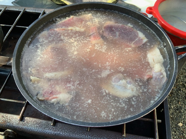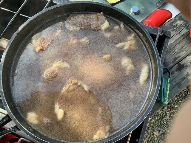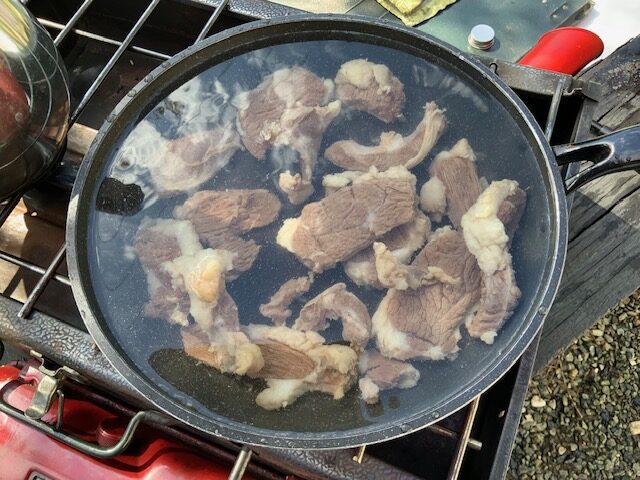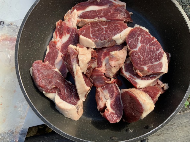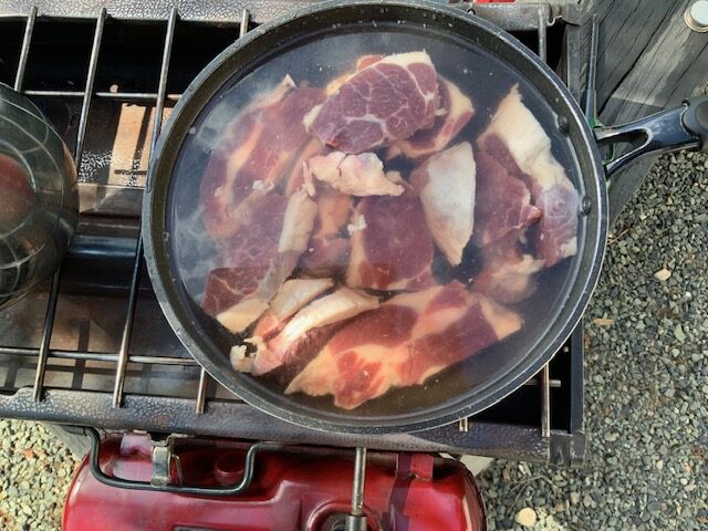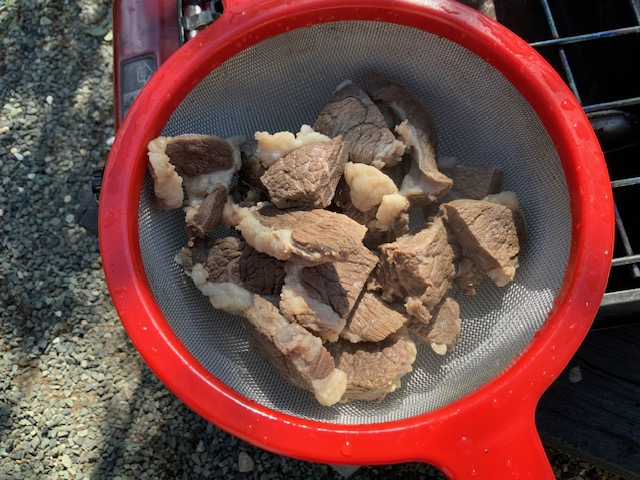 熊肉のブロック(冷凍)をいただきました。いただいてしまいました。さあ、どうしましょう。ネットで「熊肉冷凍・料理」で検索し、下処理は我が家の台所では出来ないことが分かったので、休みの日を利用し、庭に燻製づくりに使っているツーバーナー、それに、フライパン、アク取り網、ボールを準備し、まずは熊肉の臭いを消し、柔らかくする下処理作業開始。ネットで調べたとおり、①臭みが抜けやすいようにブロックを食べやすい大きさに切り、②たっぷりの水に浸し、煮ていき、③どんどんアクが出てきたので、ひたすらアクを取っていくこと1時間、④アクが出てくるのが落ち着いたので、お湯で洗い、⑤肉に付いたアクをきれいに洗ったら、⑥再び水から低温で煮て柔らかくしていく。そして、食べて柔らかくなったら下処理が完了、だけど、食べて確認するのに少し躊躇。恐る恐る食べたら…、思ったより柔らかい。トータル約2時間庭で熊肉と格闘し、ようやく家の中に。