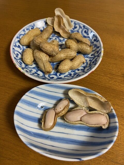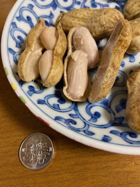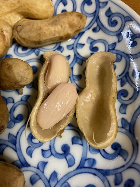 畑の師匠から落花生の苗のポットを10ポットいただいたのが6月3日。庭の畑に植えてから約5ヶ月、夏の猛暑日、ゲリラ豪雨にも負けずに順調に育ってくれました。10月初旬師匠から連絡が入り、「カラスに見つかってないな、収穫時期を連絡するので手をつけないように」とのこと。師匠の指示をしっかり守って見守ること2週間。収穫許可が来たのが10月23日。早速2株収穫したところ、予想よりもはるかに大きい落花生が2株合わせて800g。初めての生落花生なので、ネットで調理の仕方を検索。すると「生落花生は塩茹でが一番」とのこと。早速、その日の夜に塩茹でに挑戦。水の量は生落花生が完全に浸るくらい、塩は水の量の3%ぐらい。蓋をして強火、沸騰したら中火で40分ほど茹でる。たまに蓋を開けて軽く混ぜながら一つ食べてみて好みの堅さになったら、ザルにあげて水気を切ると完成とのこと。茹で上がった落花生の殻は、ネットに書かれている通り、手で簡単に剥けました。ほっこり湯気が立っている艶やかなかな落花生が登場しました。食してみるとほどよい塩味で、さっぱりとした味わい、アツアツの生落花生は日本酒にぴったりでした。あと8株残っているので、日本酒の消費量が増えてしまいそうです。体重がまた増えてしまうことが心配です。