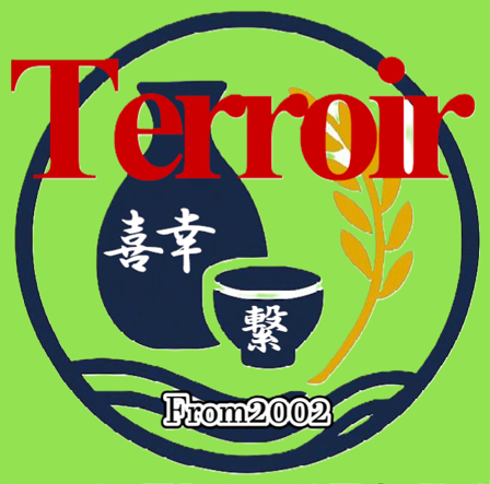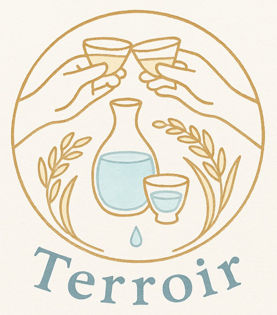 (私)「テーマ『日本酒をこよなく愛するテロワールの会』・スタイル『柔らかい線画イラスト風・温かみのある雰囲気』・モチーフ「透明な徳利に冷用のグラス、稲穂、杯を交わす手、喜び、幸せ、人と人との繋がり』・形状『円形ロゴ』・文字『Terroir』・色調『生成り地×淡い色×水色(やわらかいトーン)』でお願いします」